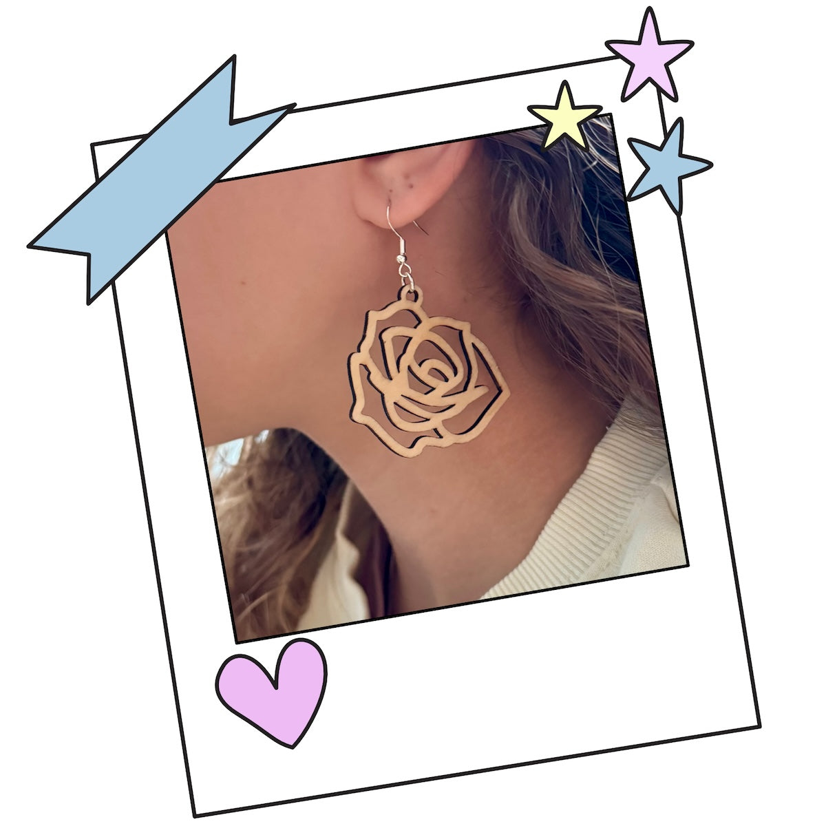 Elegante en speelse oorbellen met een houten hanger in de vorm van een roos. De haakjes zijn van 925 zilver, waardoor ze comfortabel en duurzaam zijn om te dragen. Perfect om je look een subtiele, romantische touch te geven! 🌹