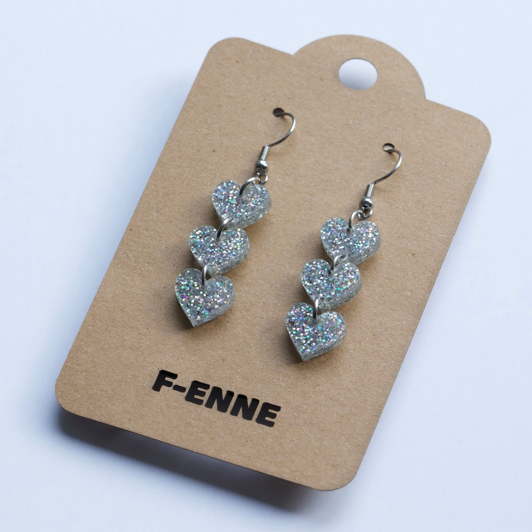 Deze verfijnde F-ENNE oorbellen bestaan uit drie transparante glitter acryl hartjes die sierlijk onder elkaar bewegen. De zachte sparkle zorgt voor een frisse, elegante uitstraling die moeiteloos past bij elke outfit.