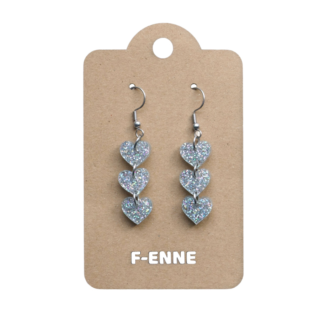 Triple hartjes oorbellen - glitter acryl - zilverkleurig